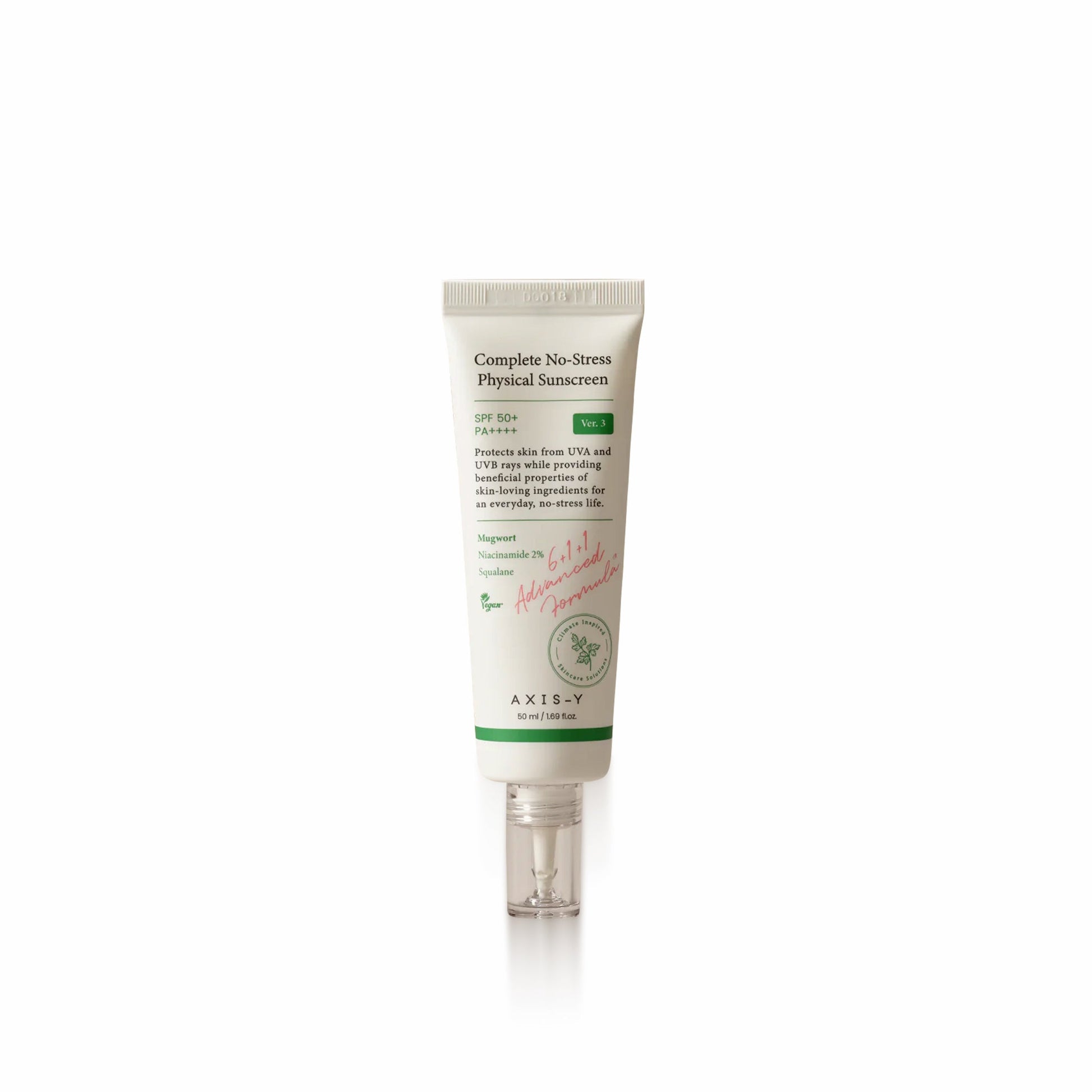 Protect and nourish your skin with the AXIS - Y Complete No-Stress Physical Sunscreen. This upgraded formula combines squalane, hyaluronic acid, and 2% niacinamide to provide deep hydration, a natural tone-up effect, and glowing skin. Enhanced with mugwort (Artemisia Capillaris), calendula, and chamomile extracts, the sunscreen offers antioxidant protection and soothes irritation, making it ideal for sensitive skin. The cream-type texture glides easily over the face and neck, delivering SPF50+ PA++++ sun protection without harsh herbal fragrances.