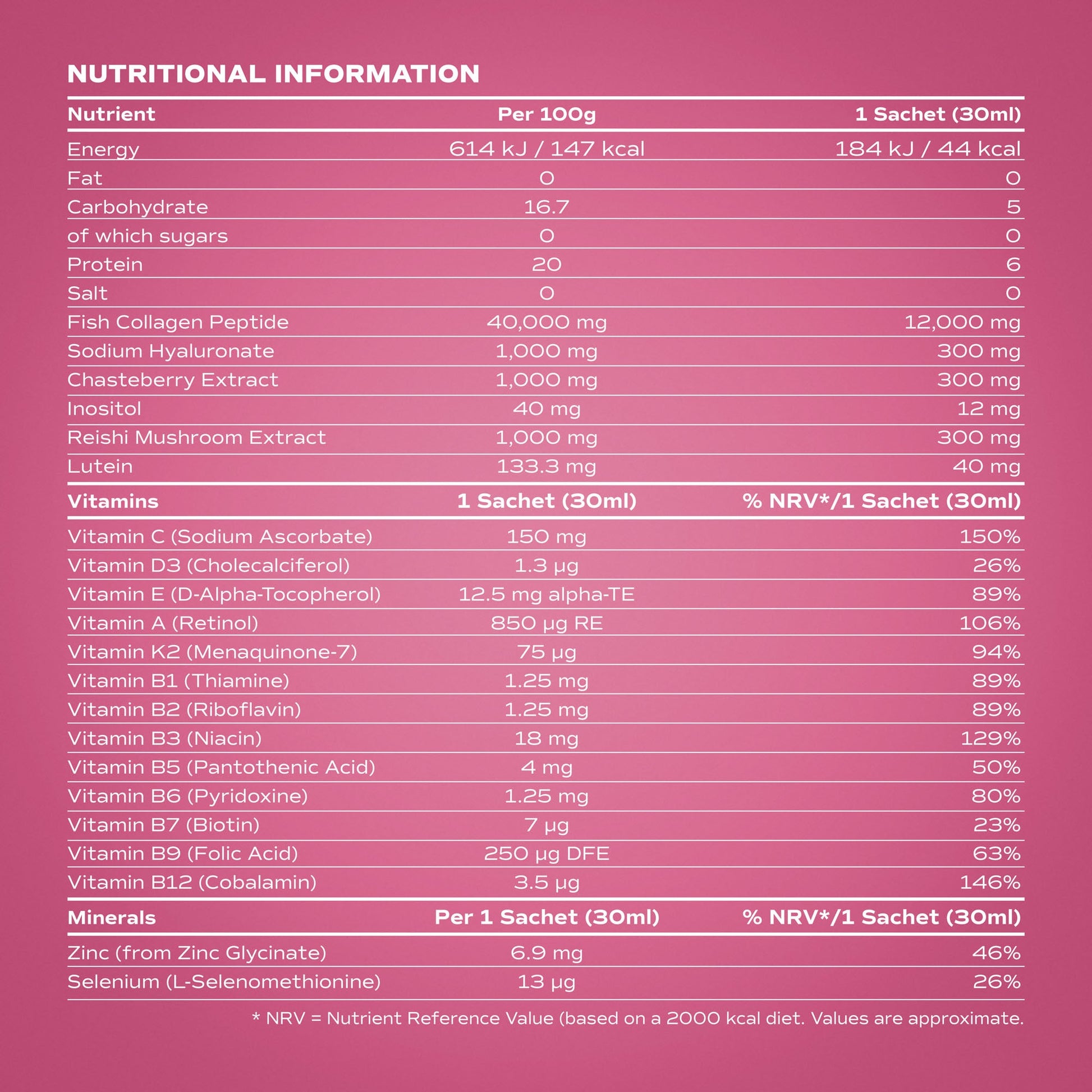 - 50% NRV of Vitamins A, B1-B12, C, D3, E, K2, Biotin and Folic Acid